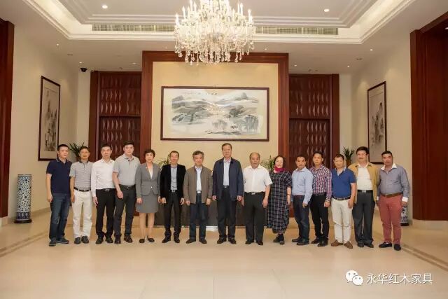 中国家具协会副理事长刘金良(左八) 中国家具协会副秘书长吴国栋(左四) 南京林业大学家居与工业设计学院教授、院长吴智慧(左七) 顺德职业技术学院设计学院教授刘晓红(右六) 广州市家具行业协会秘书长陈允(左五) 石碁镇党委书记黄钜林(右七) 石碁镇党委、副镇长许兆玲(右五) 永华红木董事长陈达强(左六) 永华红木副总经理邱志坤(左三) 华兴红木总经理陈国贤(右四) 及其他红木企业代表合影留念